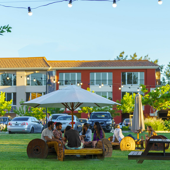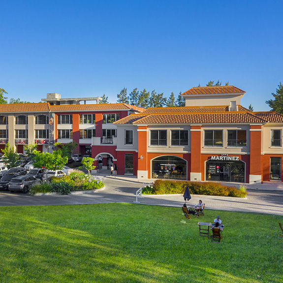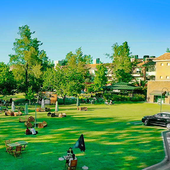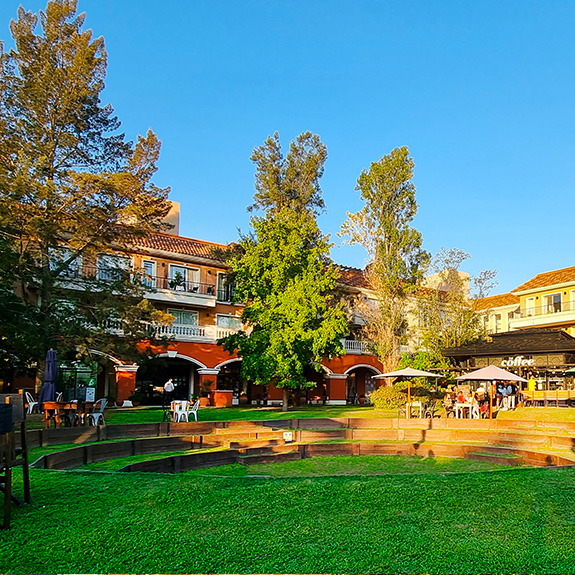 Pueblo Caamaño ofrece departamentos, estudios profesionales, un sector exclusivo de oficinas y un centro comercial entorno de un amplio anfiteatro, corazón del proyecto y lugar de encuentro para los vecinos de Pilar.